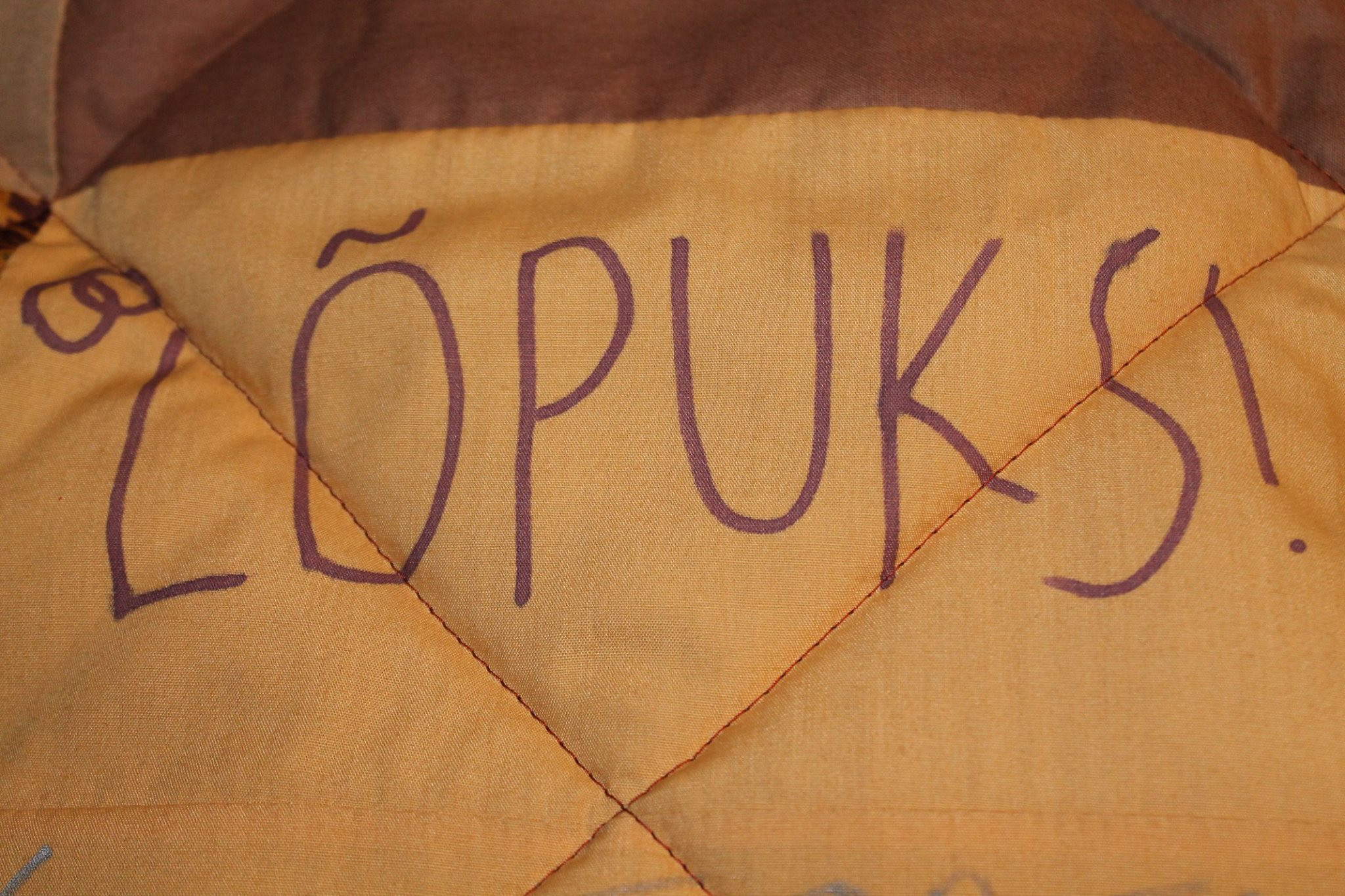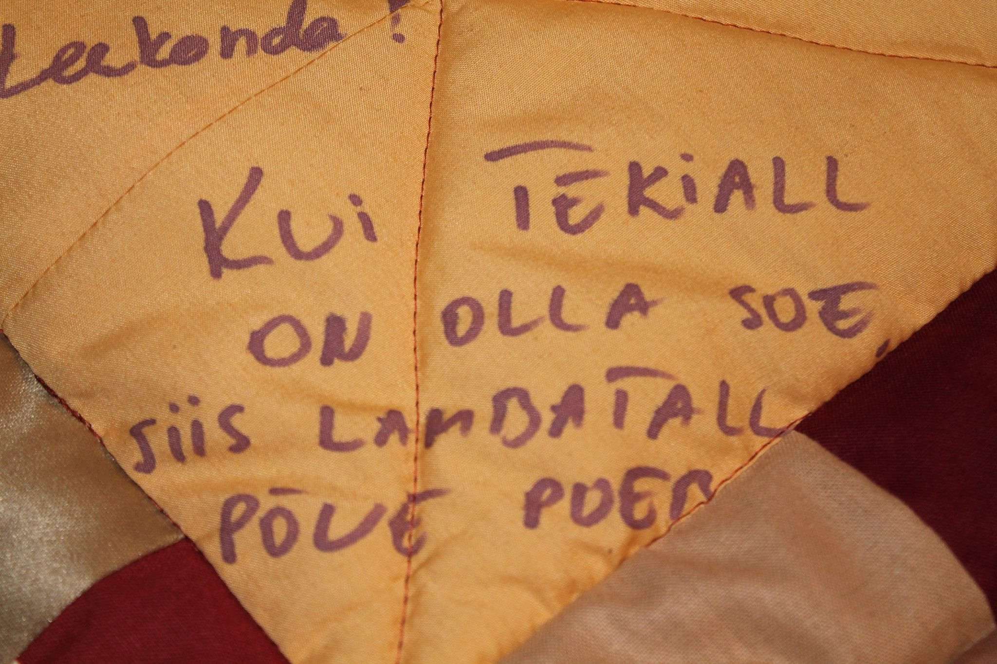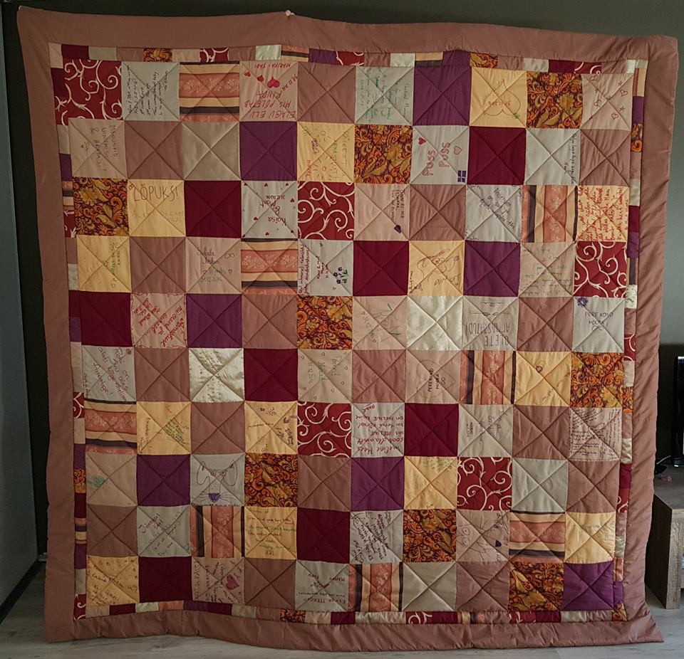 Teki detailid pidi olema piisavalt suured, et neile õnnestuks kirjutada. Ja tekki ennast polnud mõtet eelnevalt valmis õmmelda, sest siis oleks sellele kirjutamine osutunud päris ebamugavaks. Heledamad kirjutamisruudud otsustasime panna maleruutu tumedatega. Pesukindlad markerid valis Kaisa ise, nende valik on tänapäeval suur ja lai. Värvigamma oli pulmas burgundia punane, kuldne, hall ja valge- neist kaks esimest said teki põhitoonideks. Lõikasin tükid välja ja saatsin pruudile. Peale pulmi ühel ajal sain need kõik jälle oma kätte tagasi ja vormistasin nüüd tekiks.