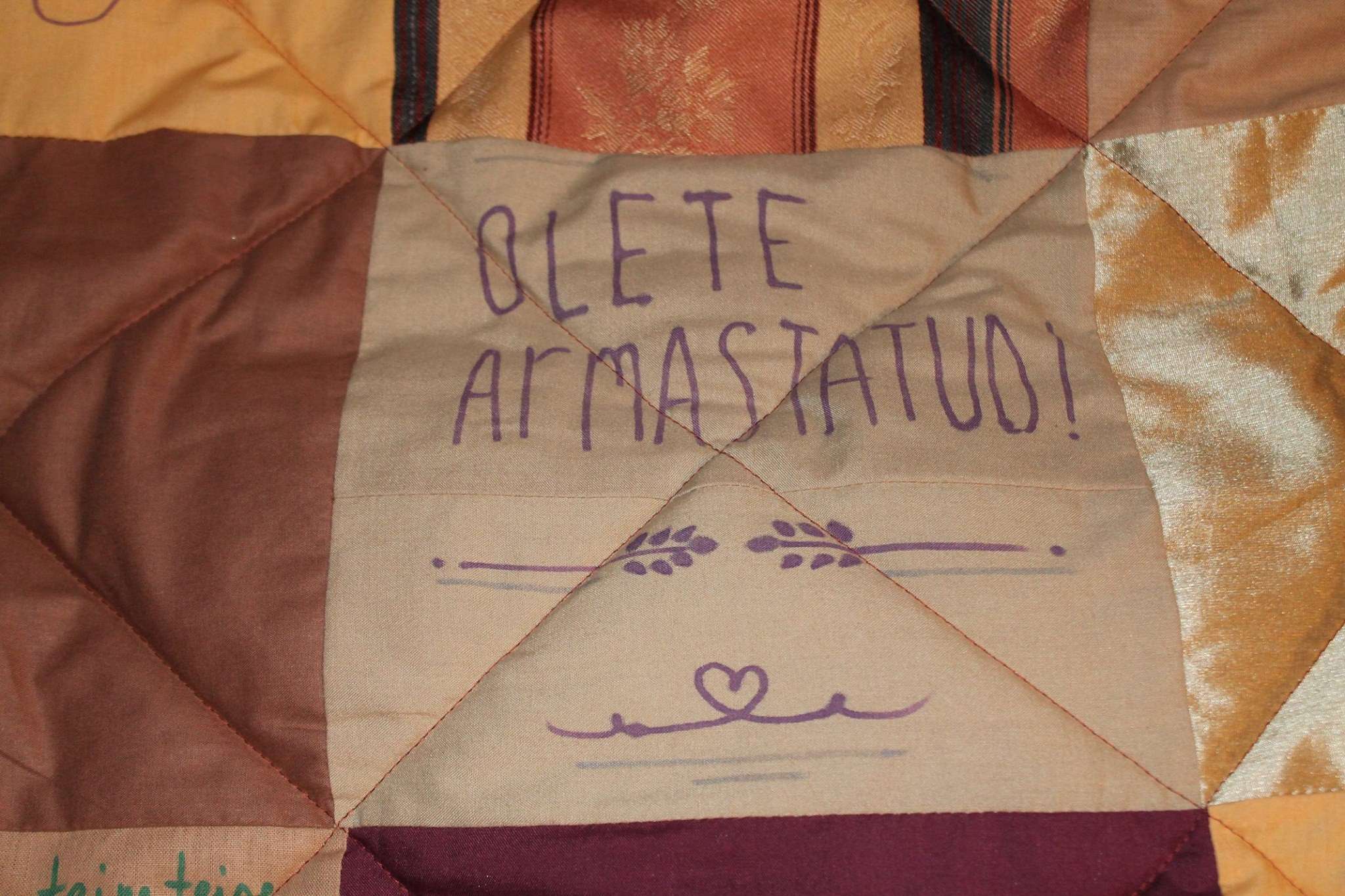Siin ta on, üks järjekordne eriline pulmatöö! Eelmise aasta lõpus võttis minuga ühendust Kaisa, kes soovis lasta ühes pulmas külalistel kirjutada noorpaarile midagi kangatükkidele, millest hiljem saaks kokku õmmelda teki. Noorte värvieelistusi ei olnudki seekord vaja salaja uurida, sest ilmnes, et Kaisa ongi pruut ning selle armsa mälestuseseme loomise korraldab ta iseendale!
