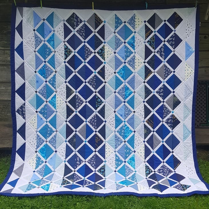Siin on täna teie ees üks näide, mis juhtub, kui tellid lapiteki rööprähklejalt- Hille ootas seda maikuust saadik! Ta muidugi ütles kohe, et asjaga pole kiiret ja täida rahulikult kiiremad tellimused enne ära, tal niikuinii läheb toa remondiga terve suvi. Aga siiski, milline kannatlikkus tema poolt! Õnneks see oli ka kõige äärmuslikum ooteaeg sel suvel. Aga siin see tulemus nüüd on! Täielik usaldus kliendi poolt. Ainuke vihje teki kohta oligi sõna "sinine". Telefonivestluses tuli jutuks, et Hille ise on elus kudunud palju vaipu kangastelgedel, seetõttu hindab kõrgelt käsitööd üldiselt ja tahtis kogeda üllatust, mida üks meister võiks teisele teha. Haarasin kinni kangakudumise ideest (paljudest väikestest detailidest koosnev üldpilt, valged lõimed vahel) ja ühest mustrist, mida olin ammu tahtnud katsetada. Peab ütlema, et see oli parimas mõttes "hunt lambanahas" - pealtnäha mitte eriti keeruline, tegelikkuses ikka päris krutskeid täis. Ma pole ammu pidanud nii täpselt jälgima, et iga ruut saaks oma koha peale täpselt õigetpidi. Et värvidel säiliks eristatus, kuid samas tekiks teatud üldistus heledate, tumedate, sinivalgemustriliste jne vahel. Et tekk jääks kerge ja mõnus üle voodi visata, sai vahele pandud üliõhuke vatiinikiht- nii sai temast sõna otseses mõttes voodikate- päevatekk.