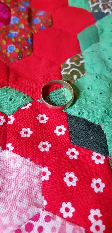 Tänaseks olen ühendanud 51 kuusnurkset lille. Nendega läheb tegelikult suht kiiresti. Iga väike kuusnurk tuleb lõigata kangast, sobitada lille värvid, õmmelda papile, õmmelda mustrisse, võtta papp tagant ära. Kokku läheb ühe lillega umbes 2 tundi. Tõeliselt aeganõudvad on aga väikesed rombid ja kolmnurgad nende vahel! Sest need on nii tillukesed, et sama hulga tööga lisandub lihtsalt nii vähe uut valmis pinda. Lisasin võrdluseks ühele fotole oma abielusõrmuse- vahekolmnurgad on umbes selle sisemõõdu suurused. Ma pole täpselt arvutanud, aga puht matemaatiliselt on juba vähemalt 150 tundi tööd tehtud, ja kui siit tuleb abieluvoodi mõõdus tekk, siis olen omadega ilmselt veerandi peal! Lisaks ei ole ma kunagi varem käsitsi tekki teppinud, kavatsen aga siin kindlasti seda teed minna.
